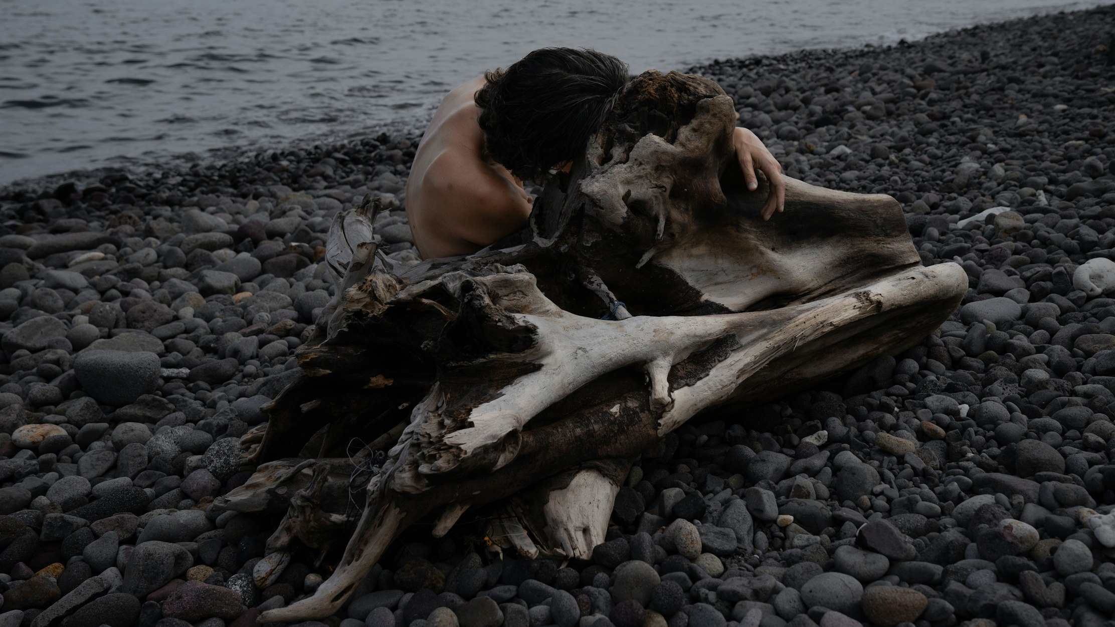 Each photograph stages a state of transformation: a bending toward the earth, an opening to the heavens, a merging with weathered driftwood as though with an ancient spirit. Through gesture and vulnerability, the body becomes an instrument for sensing the numinous.